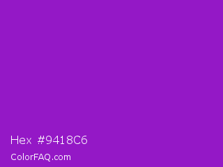 Hex #9418c6 Color is a normal purple color and the nearest color is French Violet #8806ce. Hex code #9418c6 and RGB value is rgb(148,24,198). In RGB color space, this color is composed of 58% red, 9% green, 78% blue, In CMYK color space, this color is composed of 25% cyan, 88% magenta, 0% yellow , 22% black , In HSL color space, this color has a hue angle of 283° , 78% saturation and 44% lightness.