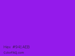 Hex #941aeb Color is a normal purple color and the nearest color is Veronica #a020f0. Hex code #941aeb and RGB value is rgb(148,26,235). In RGB color space, this color is composed of 58% red, 10% green, 92% blue, In CMYK color space, this color is composed of 37% cyan, 89% magenta, 0% yellow , 8% black , In HSL color space, this color has a hue angle of 275° , 84% saturation and 51% lightness.