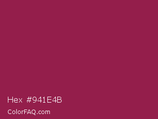 Hex #941e4b Color is a normal rose color and the nearest color is Big Dip O Ruby #9c2542. Hex code #941e4b and RGB value is rgb(148,30,75). In RGB color space, this color is composed of 58% red, 12% green, 29% blue, In CMYK color space, this color is composed of 0% cyan, 80% magenta, 49% yellow , 42% black , In HSL color space, this color has a hue angle of 337° , 66% saturation and 35% lightness.