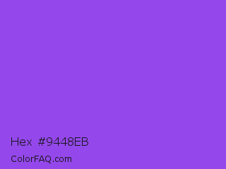Hex #9448eb Color is a normal violet color and the nearest color is Navy Purple #9457eb. Hex code #9448eb and RGB value is rgb(148,72,235). In RGB color space, this color is composed of 58% red, 28% green, 92% blue, In CMYK color space, this color is composed of 37% cyan, 69% magenta, 0% yellow , 8% black , In HSL color space, this color has a hue angle of 268° , 80% saturation and 60% lightness.