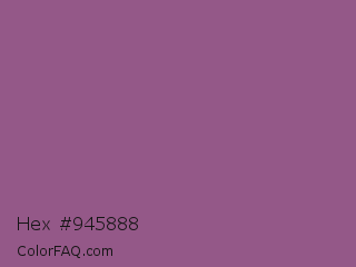 Hex #945888 Color is a normal magenta color and the nearest color is Antique Fuchsia #915c83. Hex code #945888 and RGB value is rgb(148,88,136). In RGB color space, this color is composed of 58% red, 35% green, 53% blue, In CMYK color space, this color is composed of 0% cyan, 41% magenta, 8% yellow , 42% black , In HSL color space, this color has a hue angle of 312° , 25% saturation and 46% lightness.