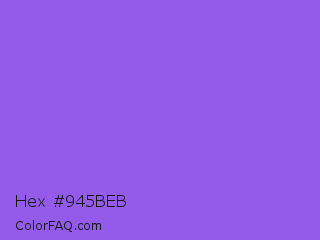 Hex #945beb Color is a light violet color and the nearest color is Navy Purple #9457eb. Hex code #945beb and RGB value is rgb(148,91,235). In RGB color space, this color is composed of 58% red, 36% green, 92% blue, In CMYK color space, this color is composed of 37% cyan, 61% magenta, 0% yellow , 8% black , In HSL color space, this color has a hue angle of 264° , 78% saturation and 64% lightness.