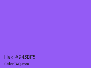 Hex #945bf5 Color is a light violet color and the nearest color is Navy Purple #9457eb. Hex code #945bf5 and RGB value is rgb(148,91,245). In RGB color space, this color is composed of 58% red, 36% green, 96% blue, In CMYK color space, this color is composed of 40% cyan, 63% magenta, 0% yellow , 4% black , In HSL color space, this color has a hue angle of 262° , 89% saturation and 66% lightness.