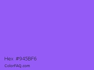 Hex #945bf6 Color is a light violet color and the nearest color is Navy Purple #9457eb. Hex code #945bf6 and RGB value is rgb(148,91,246). In RGB color space, this color is composed of 58% red, 36% green, 96% blue, In CMYK color space, this color is composed of 40% cyan, 63% magenta, 0% yellow , 4% black , In HSL color space, this color has a hue angle of 262° , 90% saturation and 66% lightness.