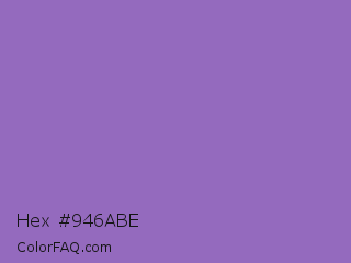 Hex #946abe Color is a normal violet color and the nearest color is Wisteria #9771b5. Hex code #946abe and RGB value is rgb(148,106,190). In RGB color space, this color is composed of 58% red, 42% green, 75% blue, In CMYK color space, this color is composed of 22% cyan, 44% magenta, 0% yellow , 25% black , In HSL color space, this color has a hue angle of 270° , 39% saturation and 58% lightness.