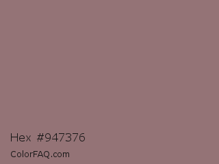 Hex #947376 Color is a normal red color and the nearest color is Hemp #907874. Hex code #947376 and RGB value is rgb(148,115,118). In RGB color space, this color is composed of 58% red, 45% green, 46% blue, In CMYK color space, this color is composed of 0% cyan, 22% magenta, 20% yellow , 42% black , In HSL color space, this color has a hue angle of 355° , 13% saturation and 52% lightness.