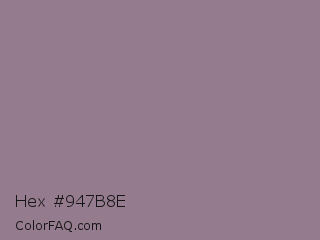 Hex #947b8e Color is a normal magenta color and the nearest color is Mountbatten Pink #997a8d. Hex code #947b8e and RGB value is rgb(148,123,142). In RGB color space, this color is composed of 58% red, 48% green, 56% blue, In CMYK color space, this color is composed of 0% cyan, 17% magenta, 4% yellow , 42% black , In HSL color space, this color has a hue angle of 314° , 10% saturation and 53% lightness.