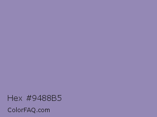 Hex #9488b5 Color is a light indigo color and the nearest color is Lavender Purple #967bb6. Hex code #9488b5 and RGB value is rgb(148,136,181). In RGB color space, this color is composed of 58% red, 53% green, 71% blue, In CMYK color space, this color is composed of 18% cyan, 25% magenta, 0% yellow , 29% black , In HSL color space, this color has a hue angle of 256° , 23% saturation and 62% lightness.