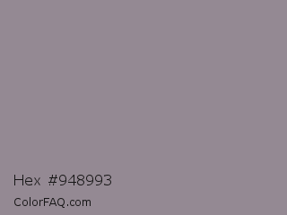 Hex #948993 Color is a normal magenta color and the nearest color is Venus #928590. Hex code #948993 and RGB value is rgb(148,137,147). In RGB color space, this color is composed of 58% red, 54% green, 58% blue, In CMYK color space, this color is composed of 0% cyan, 7% magenta, 1% yellow , 42% black , In HSL color space, this color has a hue angle of 305° , 5% saturation and 56% lightness.
