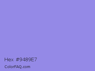 Hex #9489e7 Color is a light indigo color and the nearest color is Chetwode Blue #8581d9. Hex code #9489e7 and RGB value is rgb(148,137,231). In RGB color space, this color is composed of 58% red, 54% green, 91% blue, In CMYK color space, this color is composed of 36% cyan, 41% magenta, 0% yellow , 9% black , In HSL color space, this color has a hue angle of 247° , 66% saturation and 72% lightness.