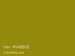 Hex #948b0e Color is a normal yellow color and the nearest color is Dark Yellow #9b870c. Hex code #948b0e and RGB value is rgb(148,139,14). In RGB color space, this color is composed of 58% red, 55% green, 5% blue, In CMYK color space, this color is composed of 0% cyan, 6% magenta, 91% yellow , 42% black , In HSL color space, this color has a hue angle of 56° , 83% saturation and 32% lightness.