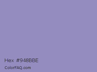 Hex #948bbe Color is a light indigo color and the nearest color is Lavender Purple #967bb6. Hex code #948bbe and RGB value is rgb(148,139,190). In RGB color space, this color is composed of 58% red, 55% green, 75% blue, In CMYK color space, this color is composed of 22% cyan, 27% magenta, 0% yellow , 25% black , In HSL color space, this color has a hue angle of 251° , 28% saturation and 65% lightness.