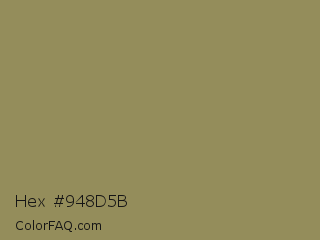Hex #948d5b Color is a normal yellow color and the nearest color is Clay Creek #8a8360. Hex code #948d5b and RGB value is rgb(148,141,91). In RGB color space, this color is composed of 58% red, 55% green, 36% blue, In CMYK color space, this color is composed of 0% cyan, 5% magenta, 39% yellow , 42% black , In HSL color space, this color has a hue angle of 53° , 24% saturation and 47% lightness.