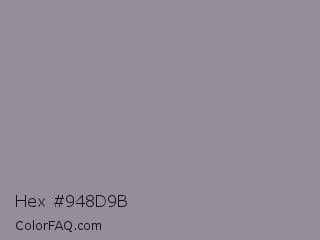 Hex #948d9b Color is a normal violet color and the nearest color is Mountain Mist #959396. Hex code #948d9b and RGB value is rgb(148,141,155). In RGB color space, this color is composed of 58% red, 55% green, 61% blue, In CMYK color space, this color is composed of 5% cyan, 9% magenta, 0% yellow , 39% black , In HSL color space, this color has a hue angle of 270° , 7% saturation and 58% lightness.