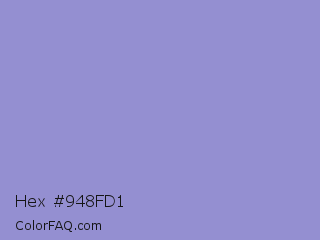 Hex #948fd1 Color is a light indigo color and the nearest color is Blue Bell Crayola #9999cc. Hex code #948fd1 and RGB value is rgb(148,143,209). In RGB color space, this color is composed of 58% red, 56% green, 82% blue, In CMYK color space, this color is composed of 29% cyan, 32% magenta, 0% yellow , 18% black , In HSL color space, this color has a hue angle of 245° , 42% saturation and 69% lightness.