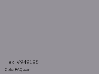 Hex #949198 Color is a normal violet color and the nearest color is Mountain Mist #959396. Hex code #949198 and RGB value is rgb(148,145,152). In RGB color space, this color is composed of 58% red, 57% green, 60% blue, In CMYK color space, this color is composed of 3% cyan, 5% magenta, 0% yellow , 40% black , In HSL color space, this color has a hue angle of 266° , 3% saturation and 58% lightness.