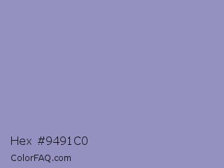 Hex #9491c0 Color is a light indigo color and the nearest color is Blue Bell Crayola #9999cc. Hex code #9491c0 and RGB value is rgb(148,145,192). In RGB color space, this color is composed of 58% red, 57% green, 75% blue, In CMYK color space, this color is composed of 23% cyan, 24% magenta, 0% yellow , 25% black , In HSL color space, this color has a hue angle of 244° , 27% saturation and 66% lightness.