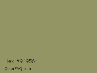 Hex #949564 Color is a normal yellow color and the nearest color is Moss Green #8a9a5b. Hex code #949564 and RGB value is rgb(148,149,100). In RGB color space, this color is composed of 58% red, 58% green, 39% blue, In CMYK color space, this color is composed of 1% cyan, 0% magenta, 33% yellow , 42% black , In HSL color space, this color has a hue angle of 61° , 20% saturation and 49% lightness.