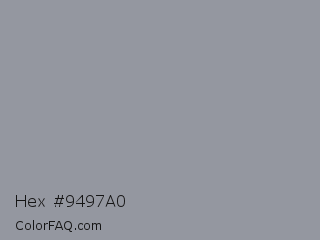 Hex #9497a0 Color is a normal blue color and the nearest color is Spanish Gray #989898. Hex code #9497a0 and RGB value is rgb(148,151,160). In RGB color space, this color is composed of 58% red, 59% green, 63% blue, In CMYK color space, this color is composed of 8% cyan, 6% magenta, 0% yellow , 37% black , In HSL color space, this color has a hue angle of 225° , 6% saturation and 60% lightness.