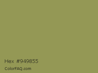 Hex #949855 Color is a normal yellow color and the nearest color is Moss Green #8a9a5b. Hex code #949855 and RGB value is rgb(148,152,85). In RGB color space, this color is composed of 58% red, 60% green, 33% blue, In CMYK color space, this color is composed of 3% cyan, 0% magenta, 44% yellow , 40% black , In HSL color space, this color has a hue angle of 64° , 28% saturation and 46% lightness.