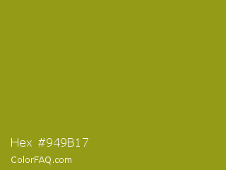 Hex #949b17 Color is a normal yellow color and the nearest color is Citron #9fa91f. Hex code #949b17 and RGB value is rgb(148,155,23). In RGB color space, this color is composed of 58% red, 61% green, 9% blue, In CMYK color space, this color is composed of 5% cyan, 0% magenta, 85% yellow , 39% black , In HSL color space, this color has a hue angle of 63° , 74% saturation and 35% lightness.