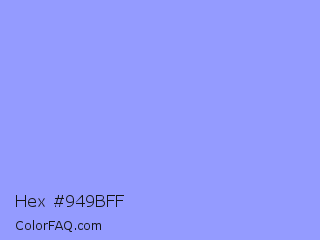 Hex #949bff Color is a light blue color and the nearest color is Portage #8b9fee. Hex code #949bff and RGB value is rgb(148,155,255). In RGB color space, this color is composed of 58% red, 61% green, 100% blue, In CMYK color space, this color is composed of 42% cyan, 39% magenta, 0% yellow , 0% black , In HSL color space, this color has a hue angle of 236° , 100% saturation and 79% lightness.