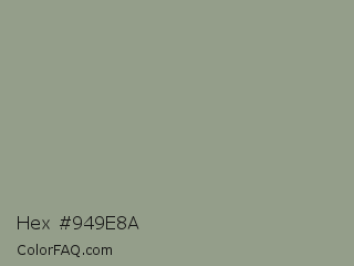 Hex #949e8a Color is a normal green color and the nearest color is Lemon Grass #9b9e8f. Hex code #949e8a and RGB value is rgb(148,158,138). In RGB color space, this color is composed of 58% red, 62% green, 54% blue, In CMYK color space, this color is composed of 6% cyan, 0% magenta, 13% yellow , 38% black , In HSL color space, this color has a hue angle of 90° , 9% saturation and 58% lightness.