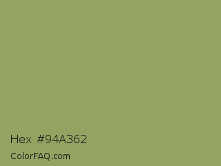 Hex #94a362 Color is a normal lime color and the nearest color is Moss Green #8a9a5b. Hex code #94a362 and RGB value is rgb(148,163,98). In RGB color space, this color is composed of 58% red, 64% green, 38% blue, In CMYK color space, this color is composed of 9% cyan, 0% magenta, 40% yellow , 36% black , In HSL color space, this color has a hue angle of 74° , 26% saturation and 51% lightness.