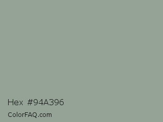 Hex #94a396 Color is a light green color and the nearest color is Morning Blue #8da399. Hex code #94a396 and RGB value is rgb(148,163,150). In RGB color space, this color is composed of 58% red, 64% green, 59% blue, In CMYK color space, this color is composed of 9% cyan, 0% magenta, 8% yellow , 36% black , In HSL color space, this color has a hue angle of 128° , 8% saturation and 61% lightness.