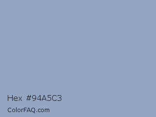 Hex #94a5c3 Color is a light blue color and the nearest color is Nepal #8eabc1. Hex code #94a5c3 and RGB value is rgb(148,165,195). In RGB color space, this color is composed of 58% red, 65% green, 76% blue, In CMYK color space, this color is composed of 24% cyan, 15% magenta, 0% yellow , 24% black , In HSL color space, this color has a hue angle of 218° , 28% saturation and 67% lightness.