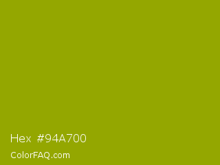 Hex #94a700 Color is a normal yellow color and the nearest color is Apple Green #8db600. Hex code #94a700 and RGB value is rgb(148,167,0). In RGB color space, this color is composed of 58% red, 65% green, 0% blue, In CMYK color space, this color is composed of 11% cyan, 0% magenta, 100% yellow , 35% black , In HSL color space, this color has a hue angle of 67° , 100% saturation and 33% lightness.