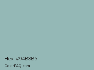 Hex #94b8b6 Color is a light cyan color and the nearest color is Summer Green #96bbab. Hex code #94b8b6 and RGB value is rgb(148,184,182). In RGB color space, this color is composed of 58% red, 72% green, 71% blue, In CMYK color space, this color is composed of 20% cyan, 0% magenta, 1% yellow , 28% black , In HSL color space, this color has a hue angle of 177° , 20% saturation and 65% lightness.