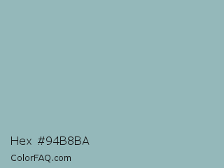 Hex #94b8ba Color is a light cyan color and the nearest color is Shadow Green #9ac2b8. Hex code #94b8ba and RGB value is rgb(148,184,186). In RGB color space, this color is composed of 58% red, 72% green, 73% blue, In CMYK color space, this color is composed of 20% cyan, 1% magenta, 0% yellow , 27% black , In HSL color space, this color has a hue angle of 183° , 22% saturation and 65% lightness.