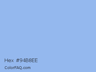 Hex #94b8ee Color is a light blue color and the nearest color is Jordy Blue #8ab9f1. Hex code #94b8ee and RGB value is rgb(148,184,238). In RGB color space, this color is composed of 58% red, 72% green, 93% blue, In CMYK color space, this color is composed of 38% cyan, 23% magenta, 0% yellow , 7% black , In HSL color space, this color has a hue angle of 216° , 73% saturation and 76% lightness.