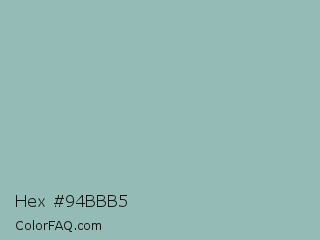 Hex #94bbb5 Color is a light cyan color and the nearest color is Shadow Green #9ac2b8. Hex code #94bbb5 and RGB value is rgb(148,187,181). In RGB color space, this color is composed of 58% red, 73% green, 71% blue, In CMYK color space, this color is composed of 21% cyan, 0% magenta, 3% yellow , 27% black , In HSL color space, this color has a hue angle of 171° , 22% saturation and 66% lightness.