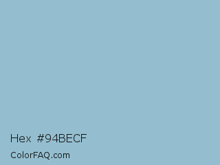 Hex #94becf Color is a light blue color and the nearest color is Dark Sky Blue #8cbed6. Hex code #94becf and RGB value is rgb(148,190,207). In RGB color space, this color is composed of 58% red, 75% green, 81% blue, In CMYK color space, this color is composed of 29% cyan, 8% magenta, 0% yellow , 19% black , In HSL color space, this color has a hue angle of 197° , 38% saturation and 70% lightness.
