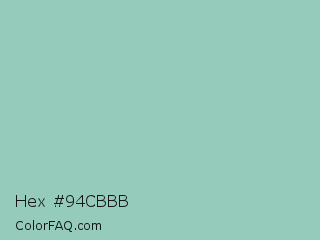 Hex #94cbbb Color is a light green color and the nearest color is Shadow Green #9ac2b8. Hex code #94cbbb and RGB value is rgb(148,203,187). In RGB color space, this color is composed of 58% red, 80% green, 73% blue, In CMYK color space, this color is composed of 27% cyan, 0% magenta, 8% yellow , 20% black , In HSL color space, this color has a hue angle of 163° , 35% saturation and 69% lightness.
