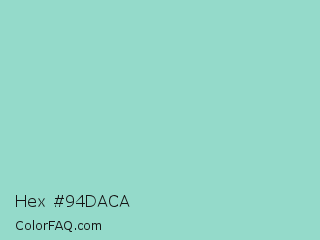 Hex #94daca Color is a light cyan color and the nearest color is Middle Blue Green #8dd9cc. Hex code #94daca and RGB value is rgb(148,218,202). In RGB color space, this color is composed of 58% red, 85% green, 79% blue, In CMYK color space, this color is composed of 32% cyan, 0% magenta, 7% yellow , 15% black , In HSL color space, this color has a hue angle of 166° , 49% saturation and 72% lightness.