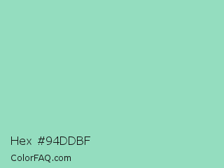 Hex #94ddbf Color is a light green color and the nearest color is Algae Green #93dfb8. Hex code #94ddbf and RGB value is rgb(148,221,191). In RGB color space, this color is composed of 58% red, 87% green, 75% blue, In CMYK color space, this color is composed of 33% cyan, 0% magenta, 14% yellow , 13% black , In HSL color space, this color has a hue angle of 155° , 52% saturation and 72% lightness.