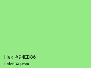 Hex #94eb86 Color is a light green color and the nearest color is Light Green #90ee90. Hex code #94eb86 and RGB value is rgb(148,235,134). In RGB color space, this color is composed of 58% red, 92% green, 53% blue, In CMYK color space, this color is composed of 37% cyan, 0% magenta, 43% yellow , 8% black , In HSL color space, this color has a hue angle of 112° , 72% saturation and 72% lightness.