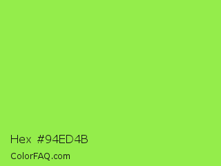 Hex #94ed4b Color is a light green color and the nearest color is Kiwi #8ee53f. Hex code #94ed4b and RGB value is rgb(148,237,75). In RGB color space, this color is composed of 58% red, 93% green, 29% blue, In CMYK color space, this color is composed of 38% cyan, 0% magenta, 68% yellow , 7% black , In HSL color space, this color has a hue angle of 93° , 82% saturation and 61% lightness.