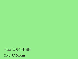 Hex #94ee8b Color is a light green color and the nearest color is Light Green #90ee90. Hex code #94ee8b and RGB value is rgb(148,238,139). In RGB color space, this color is composed of 58% red, 93% green, 55% blue, In CMYK color space, this color is composed of 38% cyan, 0% magenta, 42% yellow , 7% black , In HSL color space, this color has a hue angle of 115° , 74% saturation and 74% lightness.