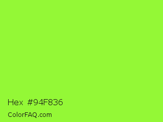 Hex #94f836 Color is a normal green color and the nearest color is French Lime #9efd38. Hex code #94f836 and RGB value is rgb(148,248,54). In RGB color space, this color is composed of 58% red, 97% green, 21% blue, In CMYK color space, this color is composed of 40% cyan, 0% magenta, 78% yellow , 3% black , In HSL color space, this color has a hue angle of 91° , 93% saturation and 59% lightness.