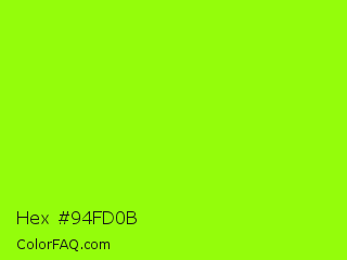 Hex #94fd0b Color is a normal green color and the nearest color is Spring Bud #a7fc00. Hex code #94fd0b and RGB value is rgb(148,253,11). In RGB color space, this color is composed of 58% red, 99% green, 4% blue, In CMYK color space, this color is composed of 42% cyan, 0% magenta, 96% yellow , 1% black , In HSL color space, this color has a hue angle of 86° , 98% saturation and 52% lightness.