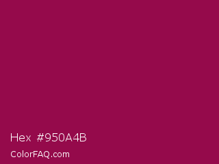 Hex #950a4b Color is a normal rose color and the nearest color is Disco #871550. Hex code #950a4b and RGB value is rgb(149,10,75). In RGB color space, this color is composed of 58% red, 4% green, 29% blue, In CMYK color space, this color is composed of 0% cyan, 93% magenta, 50% yellow , 42% black , In HSL color space, this color has a hue angle of 332° , 87% saturation and 31% lightness.