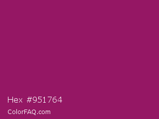 Hex #951764 Color is a normal magenta color and the nearest color is Jazzberry Jam #a50b5e. Hex code #951764 and RGB value is rgb(149,23,100). In RGB color space, this color is composed of 58% red, 9% green, 39% blue, In CMYK color space, this color is composed of 0% cyan, 85% magenta, 33% yellow , 42% black , In HSL color space, this color has a hue angle of 323° , 73% saturation and 34% lightness.