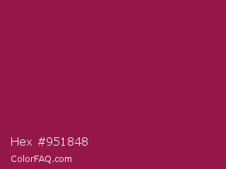 Hex #951848 Color is a normal rose color and the nearest color is Big Dip O Ruby #9c2542. Hex code #951848 and RGB value is rgb(149,24,72). In RGB color space, this color is composed of 58% red, 9% green, 28% blue, In CMYK color space, this color is composed of 0% cyan, 84% magenta, 52% yellow , 42% black , In HSL color space, this color has a hue angle of 337° , 72% saturation and 34% lightness.