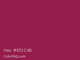 Hex #951c4b Color is a normal rose color and the nearest color is Big Dip O Ruby #9c2542. Hex code #951c4b and RGB value is rgb(149,28,75). In RGB color space, this color is composed of 58% red, 11% green, 29% blue, In CMYK color space, this color is composed of 0% cyan, 81% magenta, 50% yellow , 42% black , In HSL color space, this color has a hue angle of 337° , 68% saturation and 35% lightness.