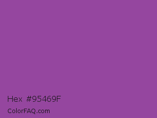 Hex #95469f Color is a normal magenta color and the nearest color is Purpureus #9a4eae. Hex code #95469f and RGB value is rgb(149,70,159). In RGB color space, this color is composed of 58% red, 27% green, 62% blue, In CMYK color space, this color is composed of 6% cyan, 56% magenta, 0% yellow , 38% black , In HSL color space, this color has a hue angle of 293° , 39% saturation and 45% lightness.