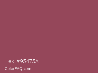 Hex #95475a Color is a normal red color and the nearest color is Vin Rouge #983d61. Hex code #95475a and RGB value is rgb(149,71,90). In RGB color space, this color is composed of 58% red, 28% green, 35% blue, In CMYK color space, this color is composed of 0% cyan, 52% magenta, 40% yellow , 42% black , In HSL color space, this color has a hue angle of 345° , 35% saturation and 43% lightness.